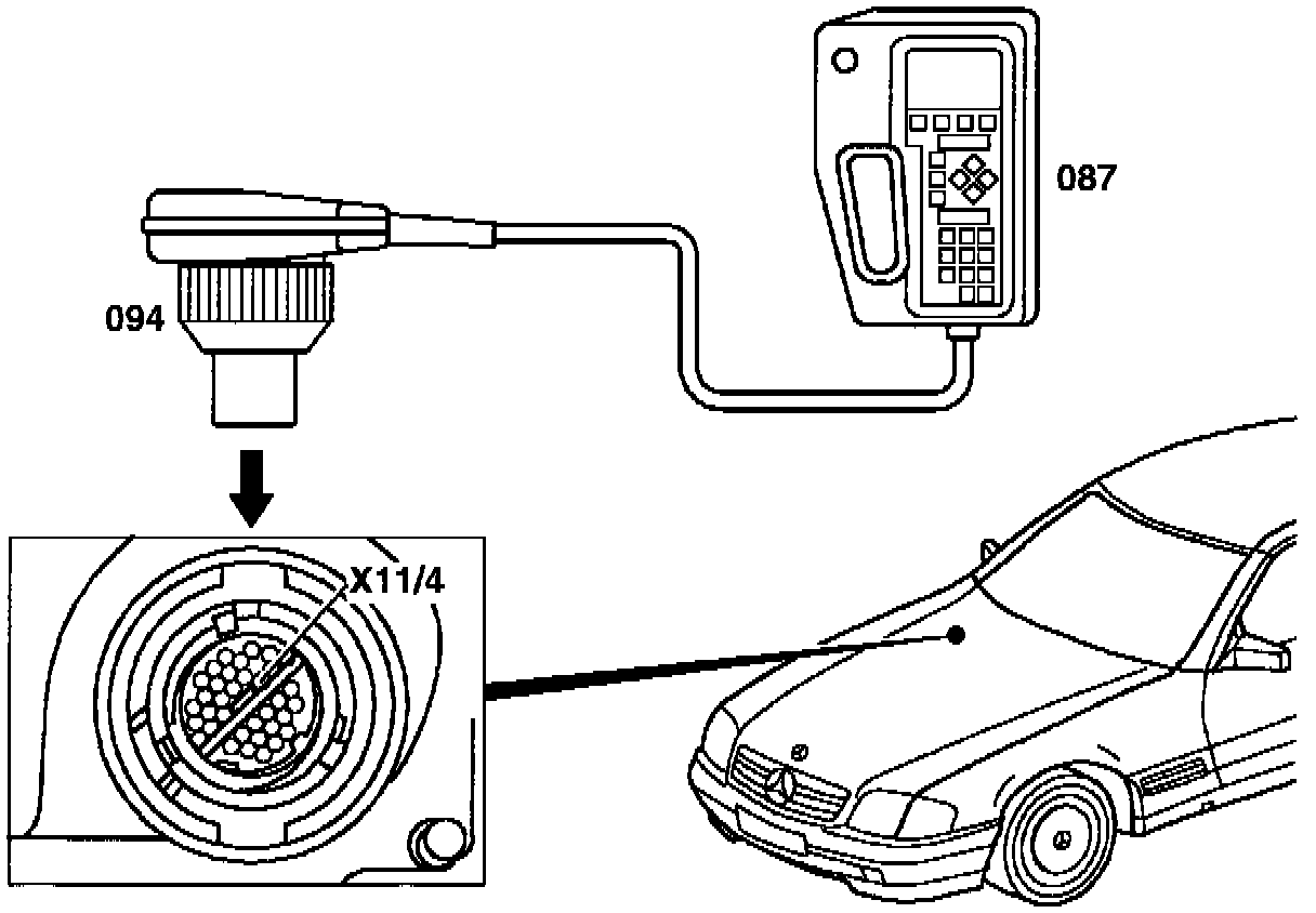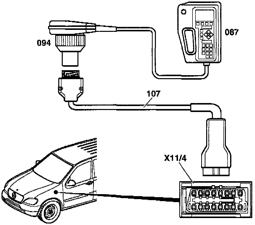 1. Connect HHT with Multiplexer (094) and Adapter cable (107) attached, to Data link connector X11/4 (located in passenger compartment).
