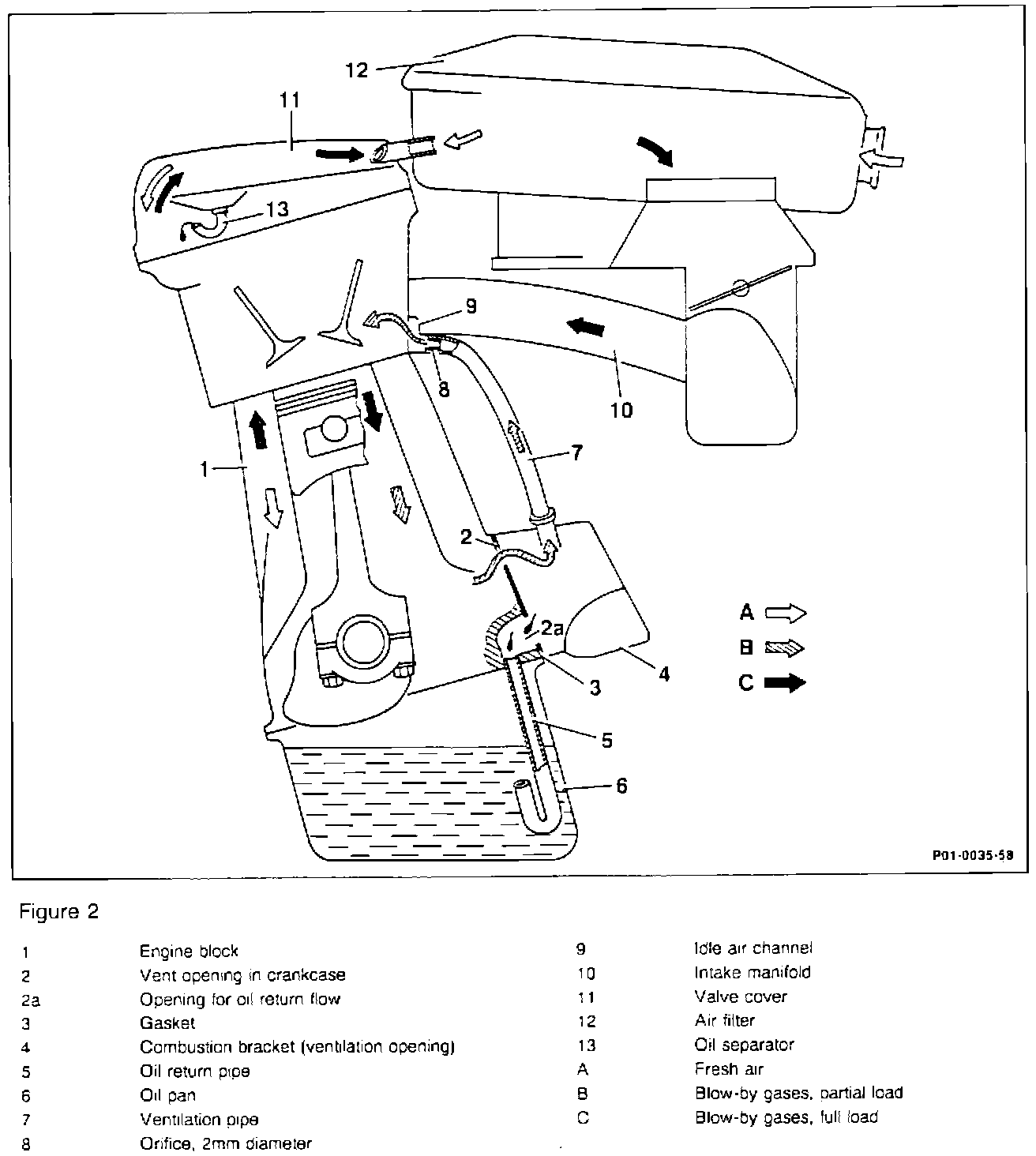 The function of the crankcase ventilation system is shown in Figure 2. The crankcase is ventilated through the vapor separator (4) into the intake manifold (10), and into the idle air channel (9) through a 2 mm orifice (Figures 1, 2). The engine oil in the vapor is separated in the vapor separator (4) and runs back through an oil return pipe (5) to the oil pan (6). The ventilation of the valve cover through the air filter (12) and into the intake manifold (10) prevents formation of oil sludge. Blow-by gases are drawn from the crankcase through the orifice (8) into the intake manifold. If the volume of gas drawn through this system is greater than the amount of blow-by gas past the pistons and piston rings, then the crankcase is ventilated with fresh air from the air filter through the valve cover ventilation system.