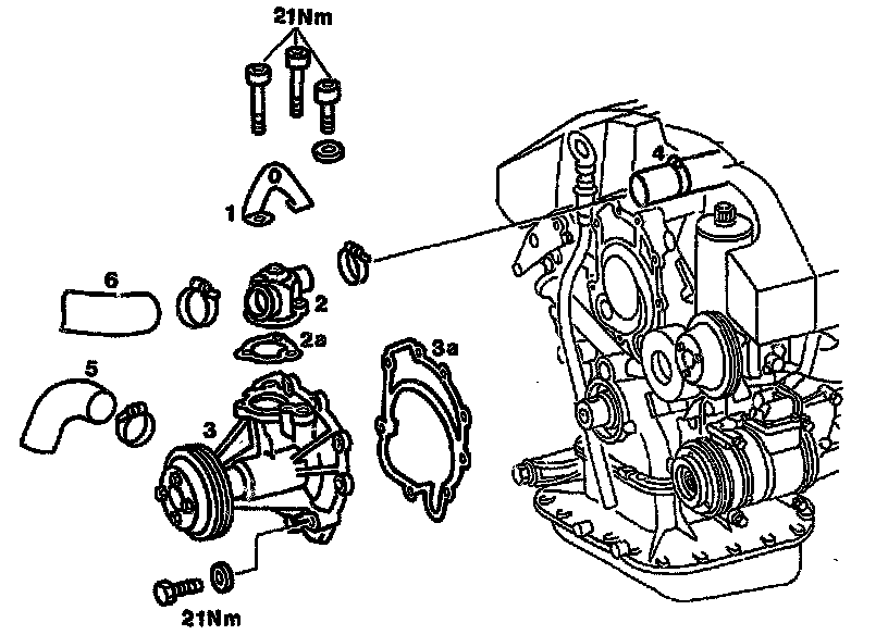 - Tighten the bolts of cover at top to coolant pump to: 21 Nm