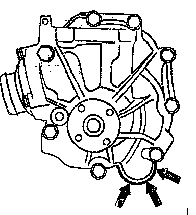 - The coolant pump must not touch the timing case cover at the bottom (arrows) otherwise the attaching hose and the gasket may not be aligned and the top attaching eye may shear off.