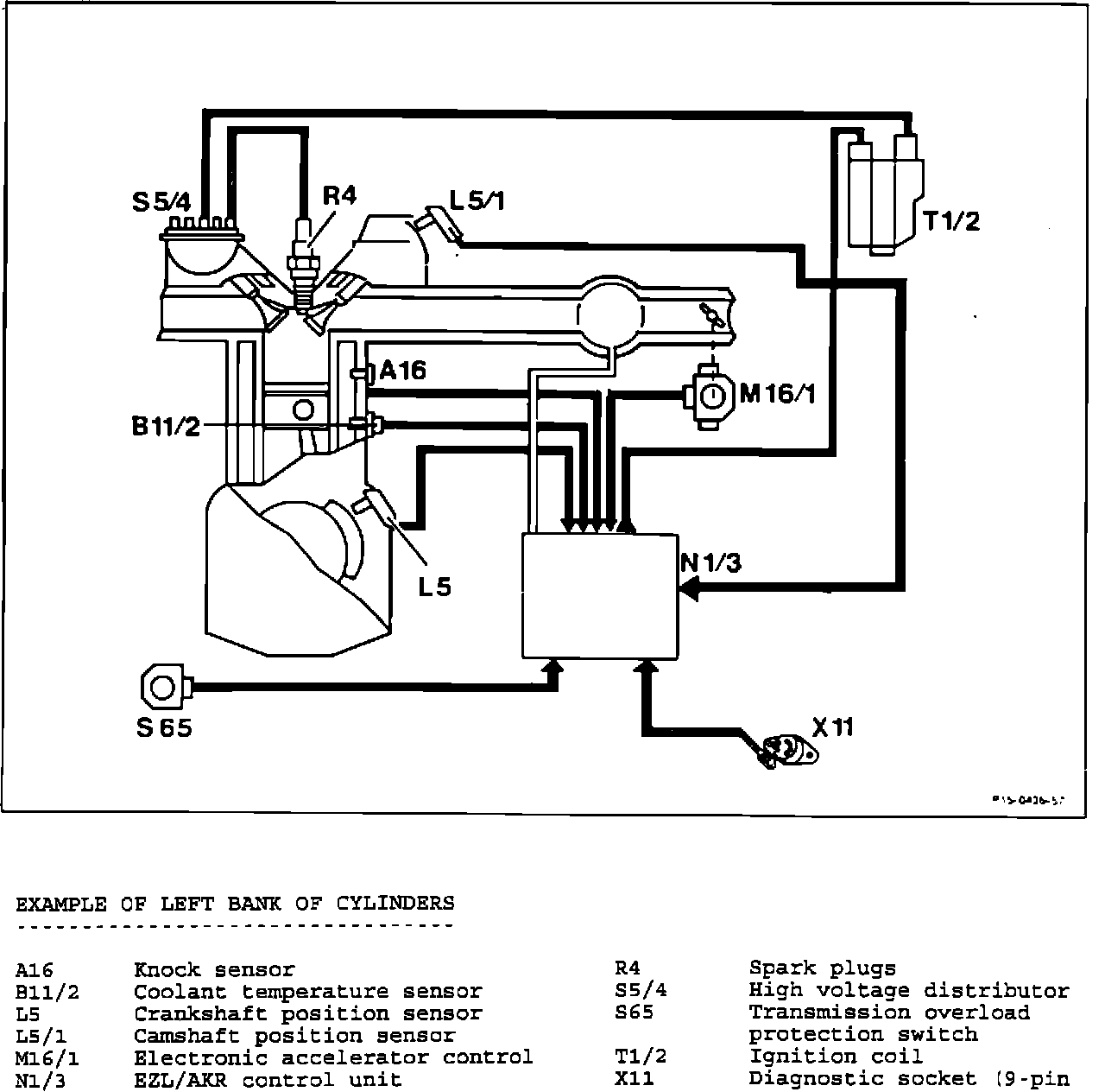 The EZL/AKR computerized ignition system consists of the EZL/AKR control module (N1/3), two ignition coils (T1/1 and T1/2), two high-tension distributors (S5/5 and S5/6), ignition wires with suppression connectors and spark plugs (R4).