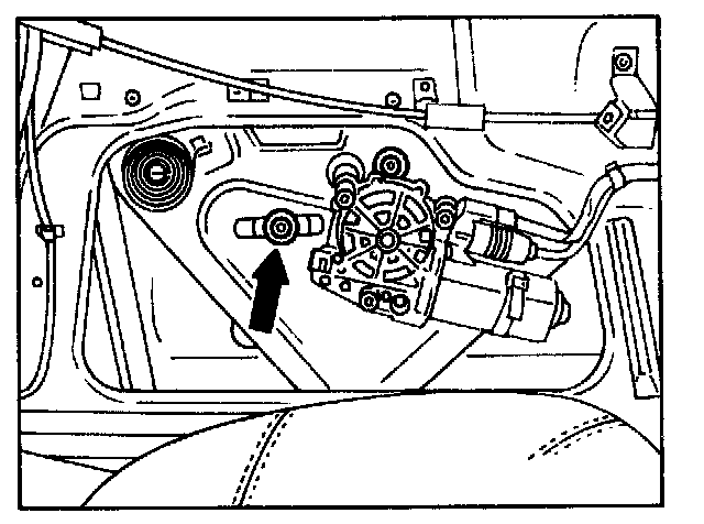 press from outside forward and up into sealing frame, then tighten screws on rear window lift arm through top assembly hole (arrow) without opening front door.