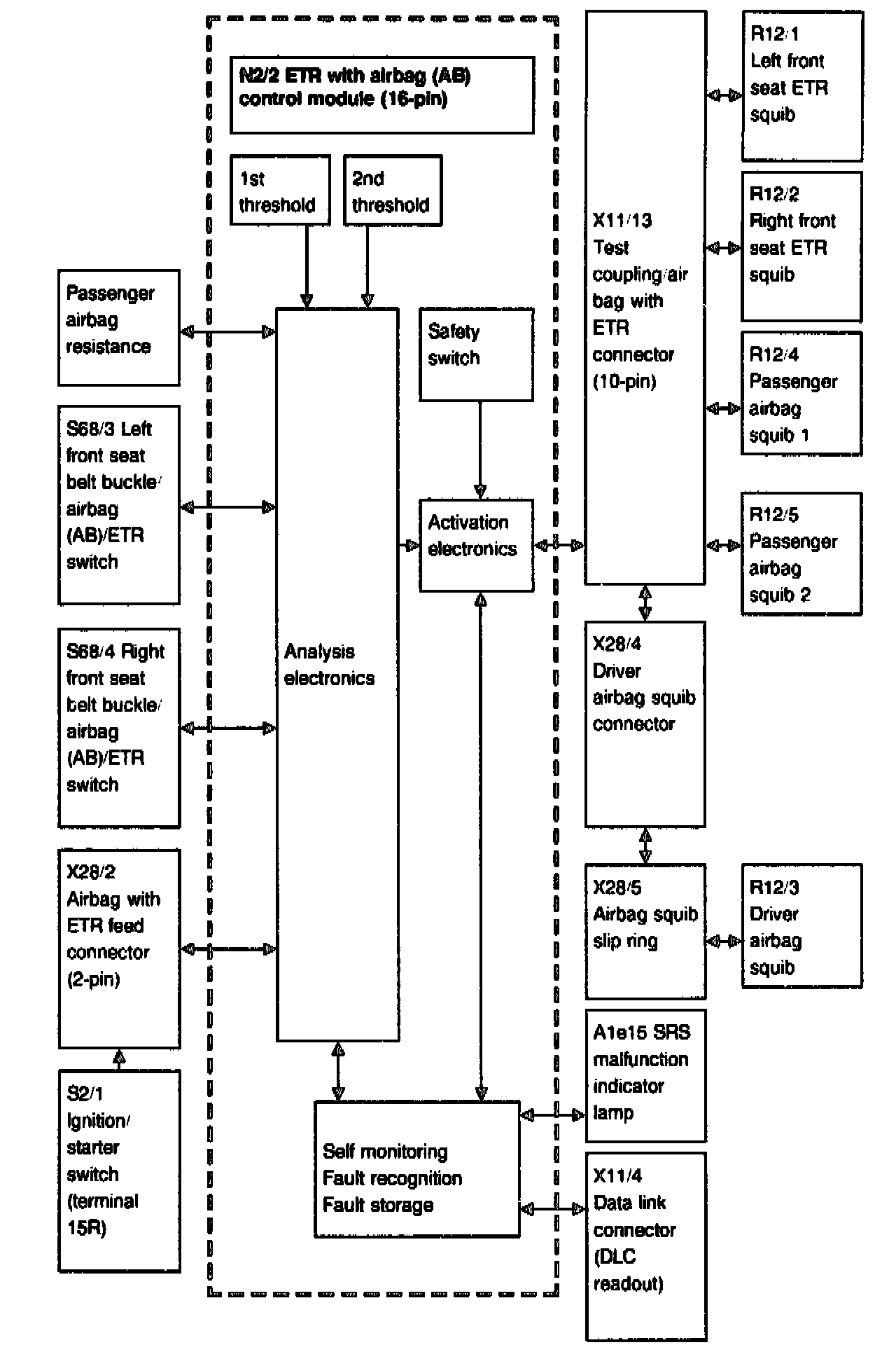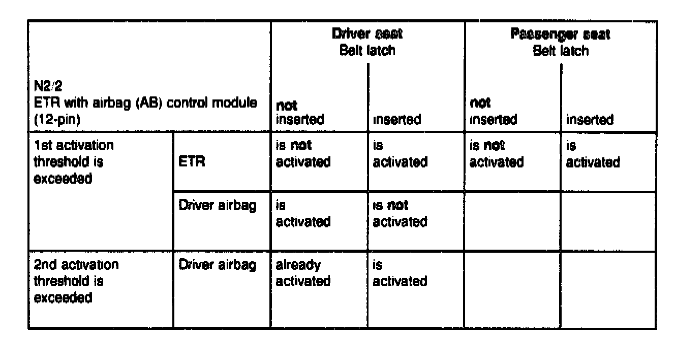 An acceleration sensor integrated in the control module detects the deceleration to which the car is subjected in the longitudinal direction and passes a signal, which is appropriately conditioned, to the threshold switch, for analysis. If the set triggering thresholds of the two thresholds switches are exceeded, the output stages are switched through in accordance with the states detected at the seat belt buckle switches (latch inserted in buckle or not). This causes the restraint system to be triggered. If the power supply is interrupted during an accident, the driver airbag can still be ignited within 100 ms but not the two emergency tensioning retractors. The SRS malfunction indicator lamp (A1e15) comes on if the system voltage is < 9.5 V for longer than 10 s, and goes out if the voltage is > 10 V.