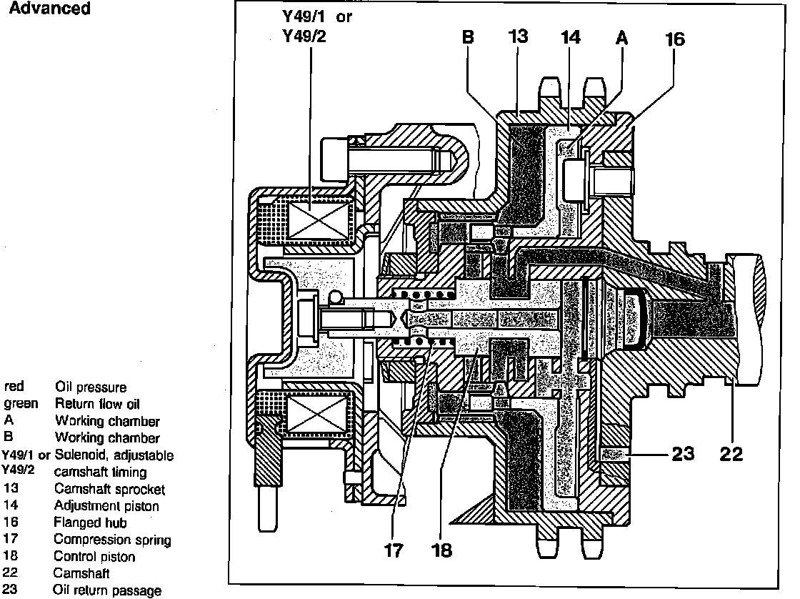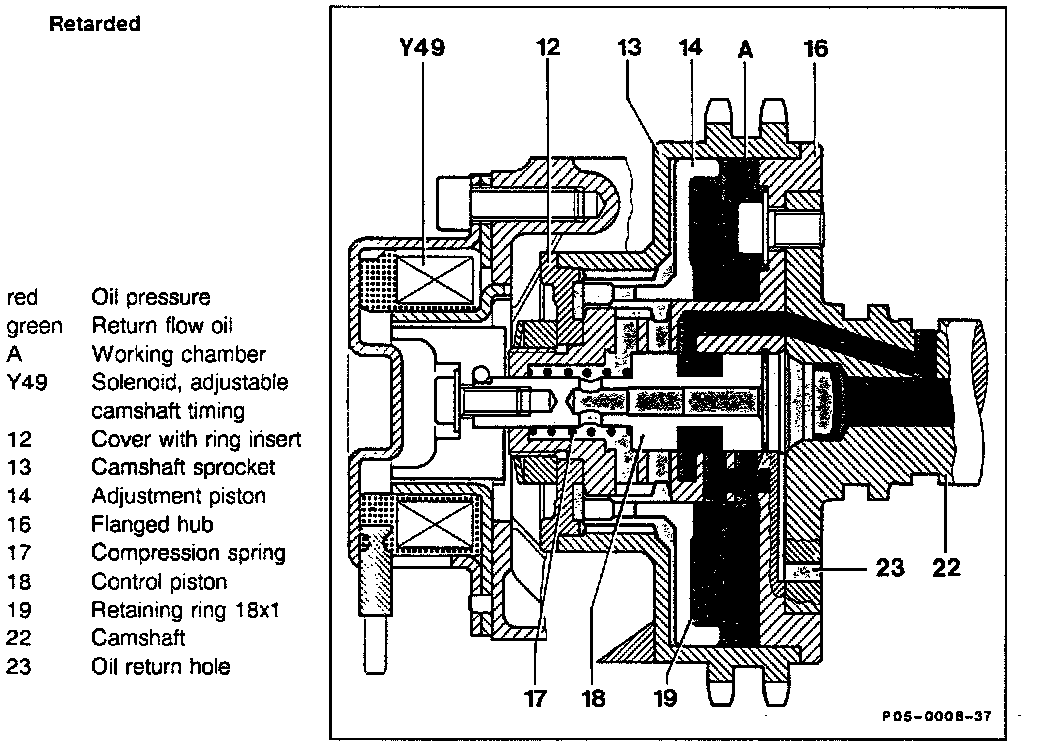 When the LH control units remove the current to the solenoids the camshafts return to the retarded position. The camshaft position sensors monitor camshaft position as an input parameter for the EZL/AKR control units.