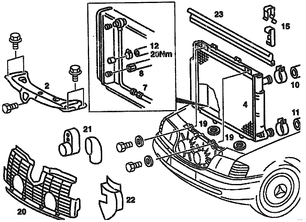 14. - The securing studs of the radiator must be inserted into the rubber pads (19) of the bottom cross member.