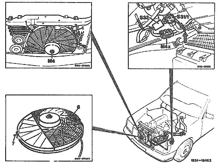 - Check auxiliary fan operation by switching on ignition and bridging both connections on pressure switch (S32). Do not separate connections on cable harness.