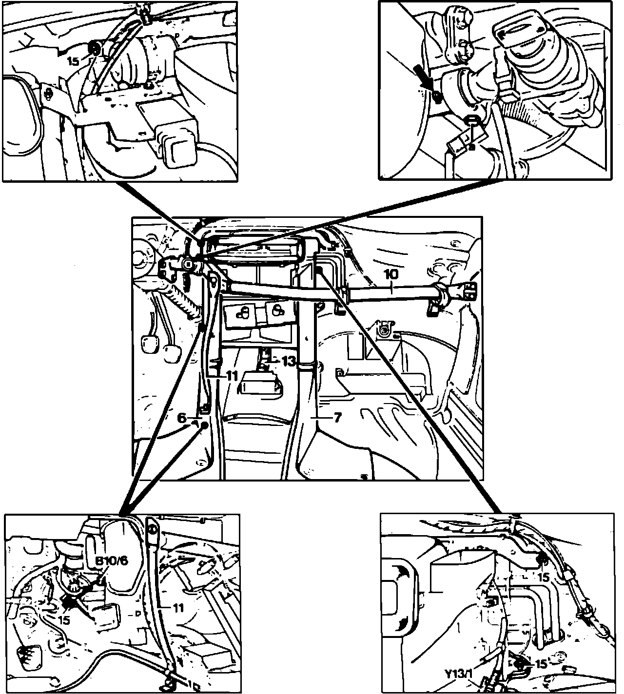 18. Remove the 4 mount nuts (15), remove the outside temperature sensor (B10/5), and pull the heater and A/C box downward and out.