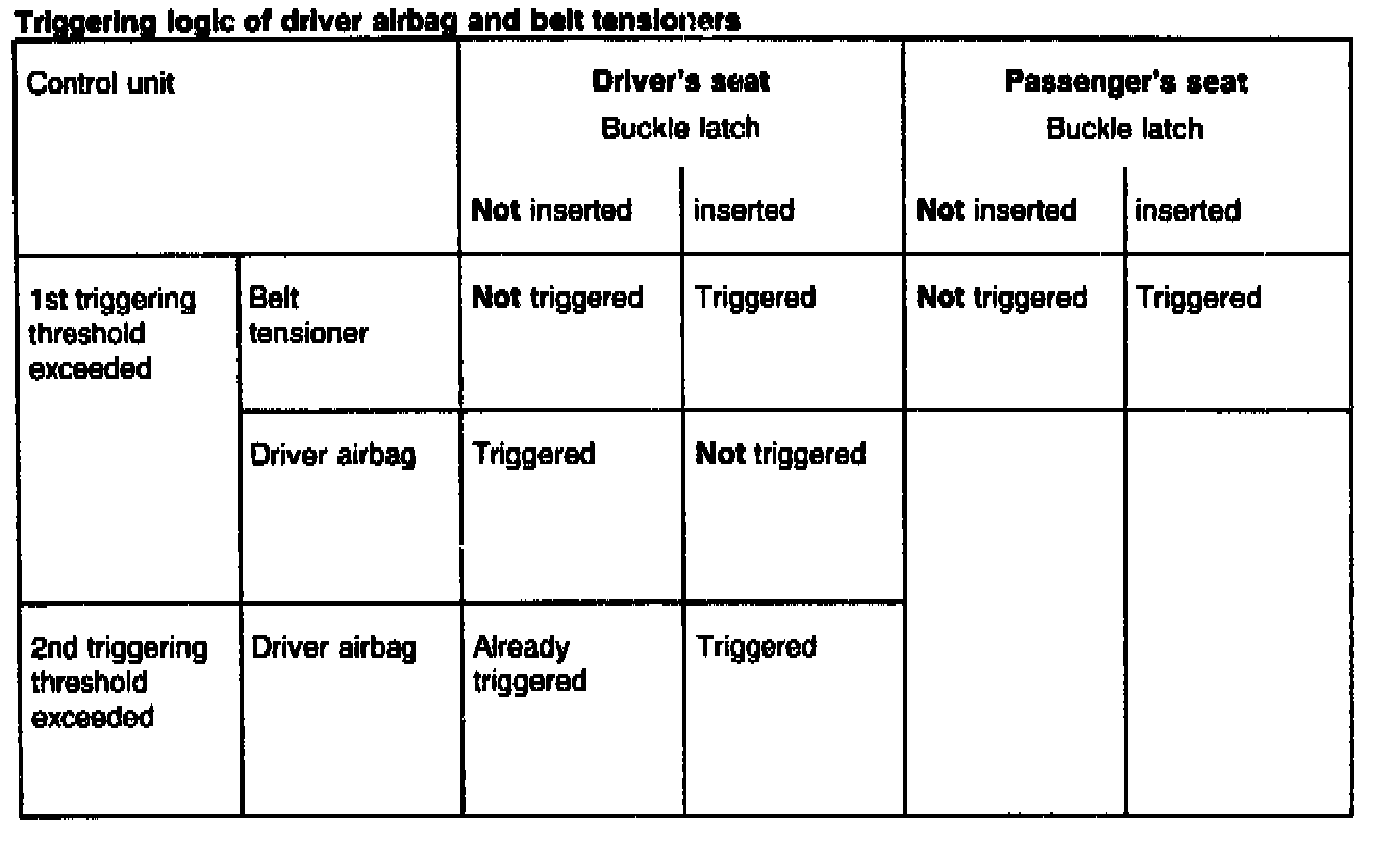 An acceleration sensor installed in the control unit detects the deceleration acting on the vehicle in the longitudinal direction and sends an appropriately conditioned signal to the trigger switches for evaluation. If the fixed triggering thresholds of both trigger switches are exceeded, the output stages are activated as is appropriate for the circumstances detected via the belt buckle switch (buckle latch in/not in belt buckle) This results in triggering of the system (see table below). If the power supply is interrupted during a collision, the driver airbag can still be triggered within 100 ms, but not the two belt tensioners. The warning lamp lights up if the vehicle voltage is < 9.5 V for longer than 10 s. The lamp goes out at a voltage > 10 V.