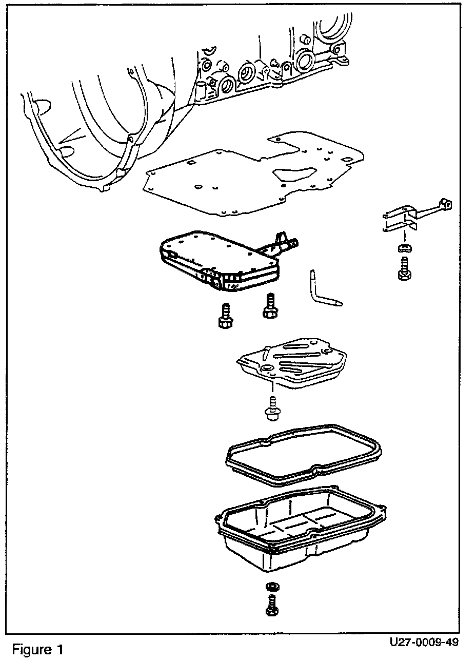 1. Remove transmission oil pan and gasket, oil filter, valve body and large intermediate plate, (Figure 1) (SMS Job Nos. 27-400 and 27-430).