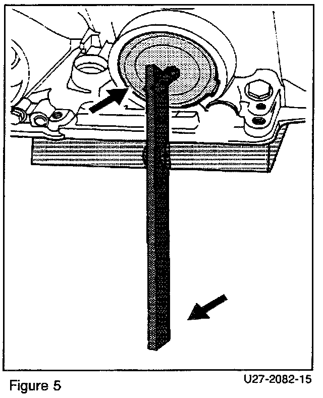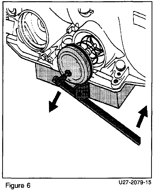 6. Carefully release compressing lever inward, in direction of lower arrow (Figure 6), to remove piston B-1 from transmission housing.