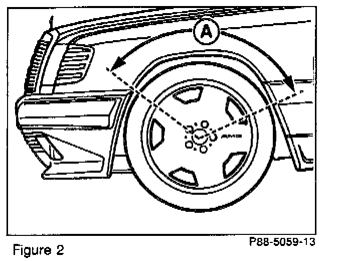 5. The fender lip is reworked over the entire area (A, Figure 2) in several stages. A plastic hammer must be used to avoid damaging the paint.