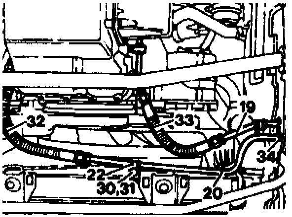 2. Seal off oil hoses (32, 33) on oil lines (19, 20). Remove clamp (22).