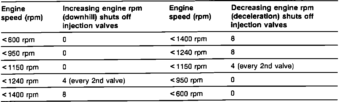 During deceleration, the fuel injectors are turned off (in all gears) if engine temperature is above 70 °C (158 °F). The engine speeds for injection cut-off/ restart are shown in the chart.