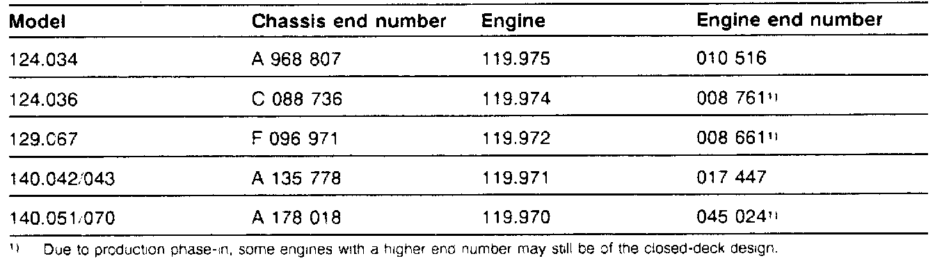As of April 1993, an open-deck engine block was phased into production in engine 119.975 (model 124.034) and in engine 119.971 (models 140.042/043).