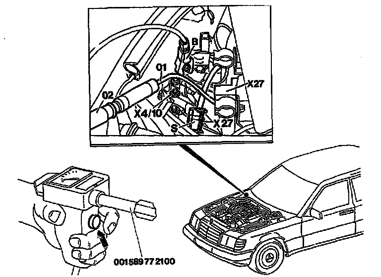 - Connect adapter cable (01) of special tool 124 589 36 63 00 with plug connection (X27)