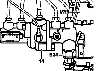 The ESP brake pressure sensor (B34) is attached to the pressure chamber for the front axle circuit.