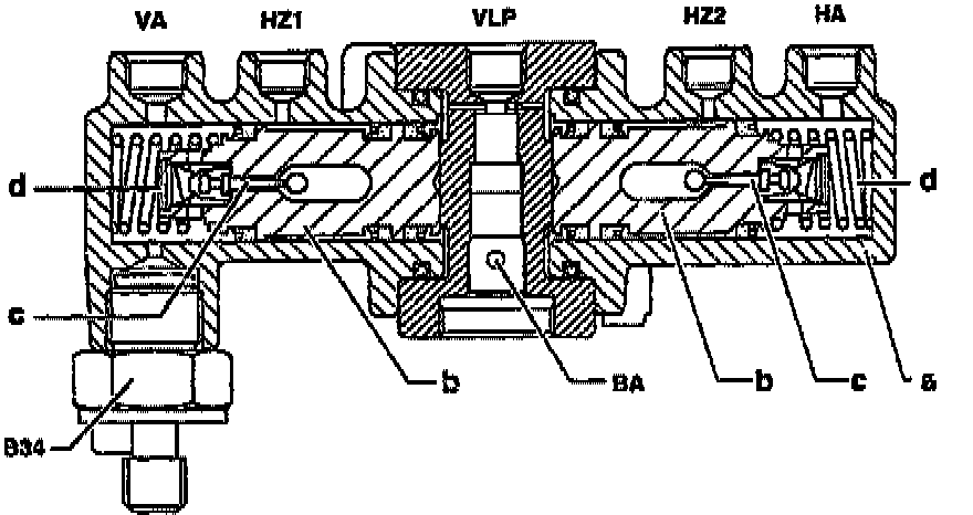 When the pressurizing piston is in this position, the central valves (c) of both circuits located at the end face are opened.