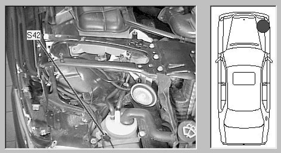 Lower right front of Engine compartment, on top of washer fluid reservoir, beneath RF headlamp.