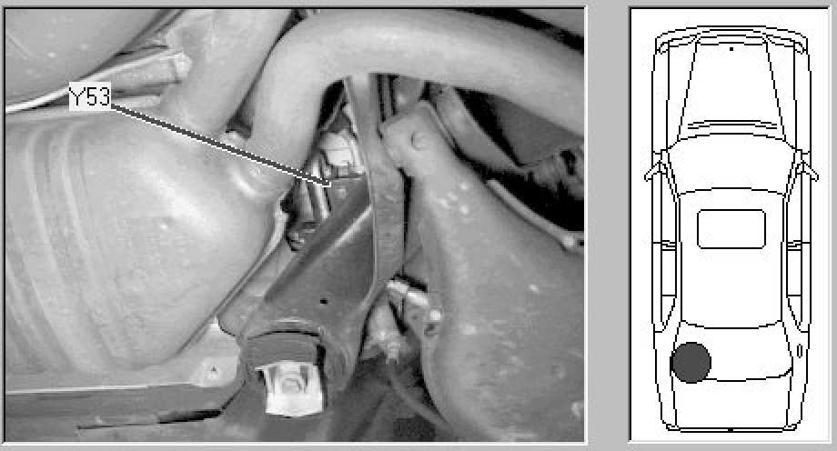 Beneath vehicle, above left rear axle, mounted on underside of trunk floor