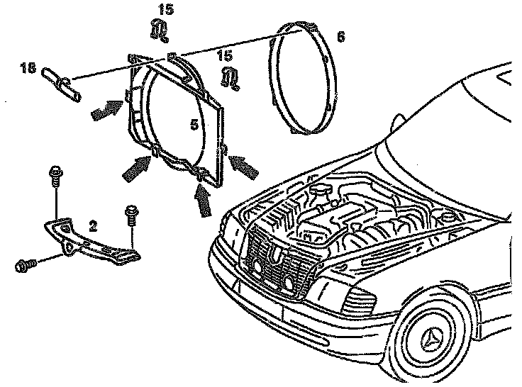 - Insert retaining plates (arrows) of fan shroud (5) into the mounts on the radiator.