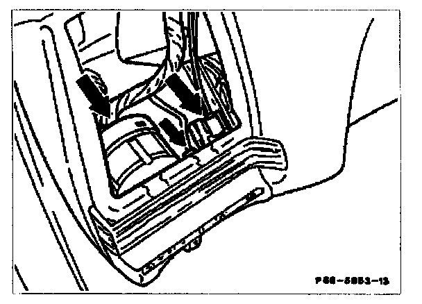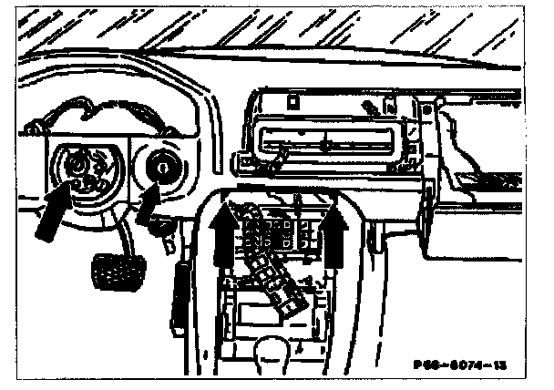 14. Lift panel over center console (arrows) and air connections at top, then pull back on passenger side and move out at steering column and ignition lock.