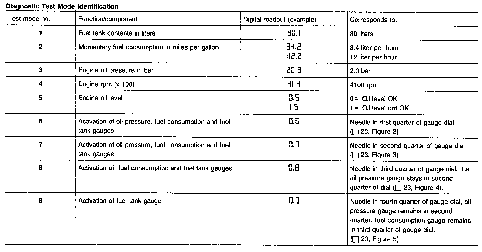 ^ During test mode 2, "Momentary fuel consumption in liters per hour," consumption values of less than 9.9 l/h are shown multiplied by 10: