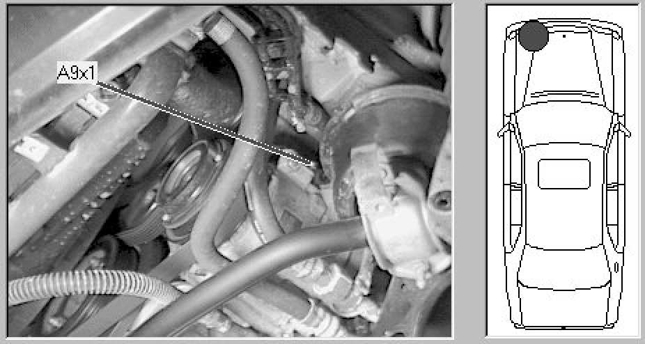 Engine compartment, lower left front of engine, rear top of A9.