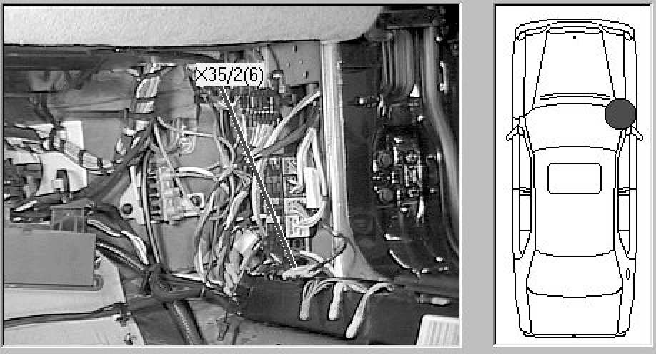 Passenger compartment, in Passenger's footwell, at base of A-pillar, colored orange (SRS).