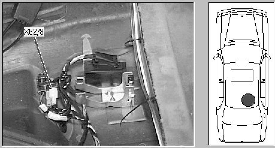 Passenger compartment (also Beneath vehicle), beneath right rear seat, against rear wall of under-seat area.
