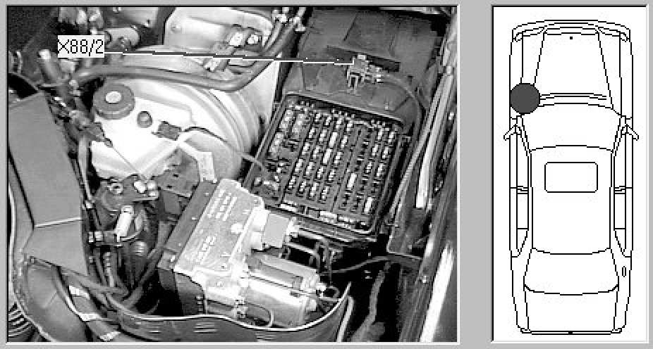 Left rear of Engine compartment, in left component compartment, attached to top rear of fusebox (F3).