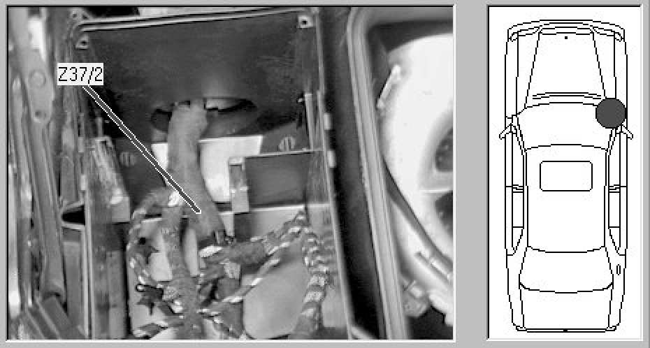 RR of Engine comp., beneath control module box, in thick harness, betw. yellow tape and N16/1 horn. branch (not vis. in photo).