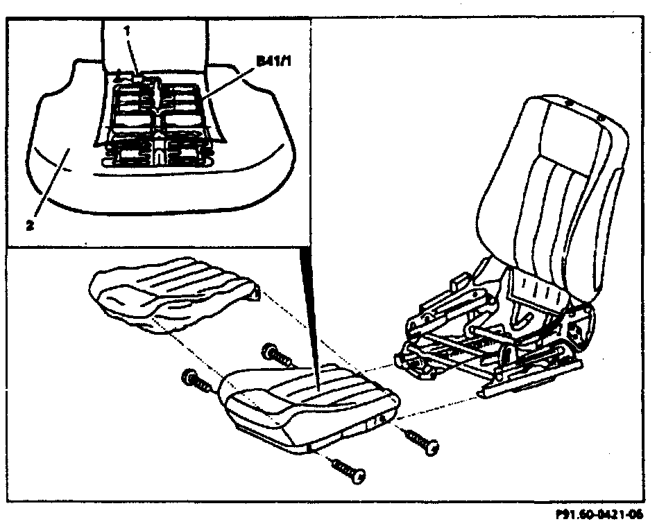 2. Unclip electrical connectors [1] for seat cushion on seat connector strip.