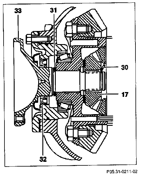 Check and adjust axial play of connecting flange1. Check axial play between connecting flange (33) and rear axle side gear (17). If necessary install thinner or thicker C-spacer (30a)