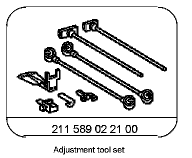 1 Insert adapter (C) into the guide (arrow) of the angle gauge (A) and fasten with knurled bolt to angle gauge (A). Use adapter (C) and angle gauge (A) from the adjustment tool set. For model 171.4 use adapter with tool number 211 589 05 21.