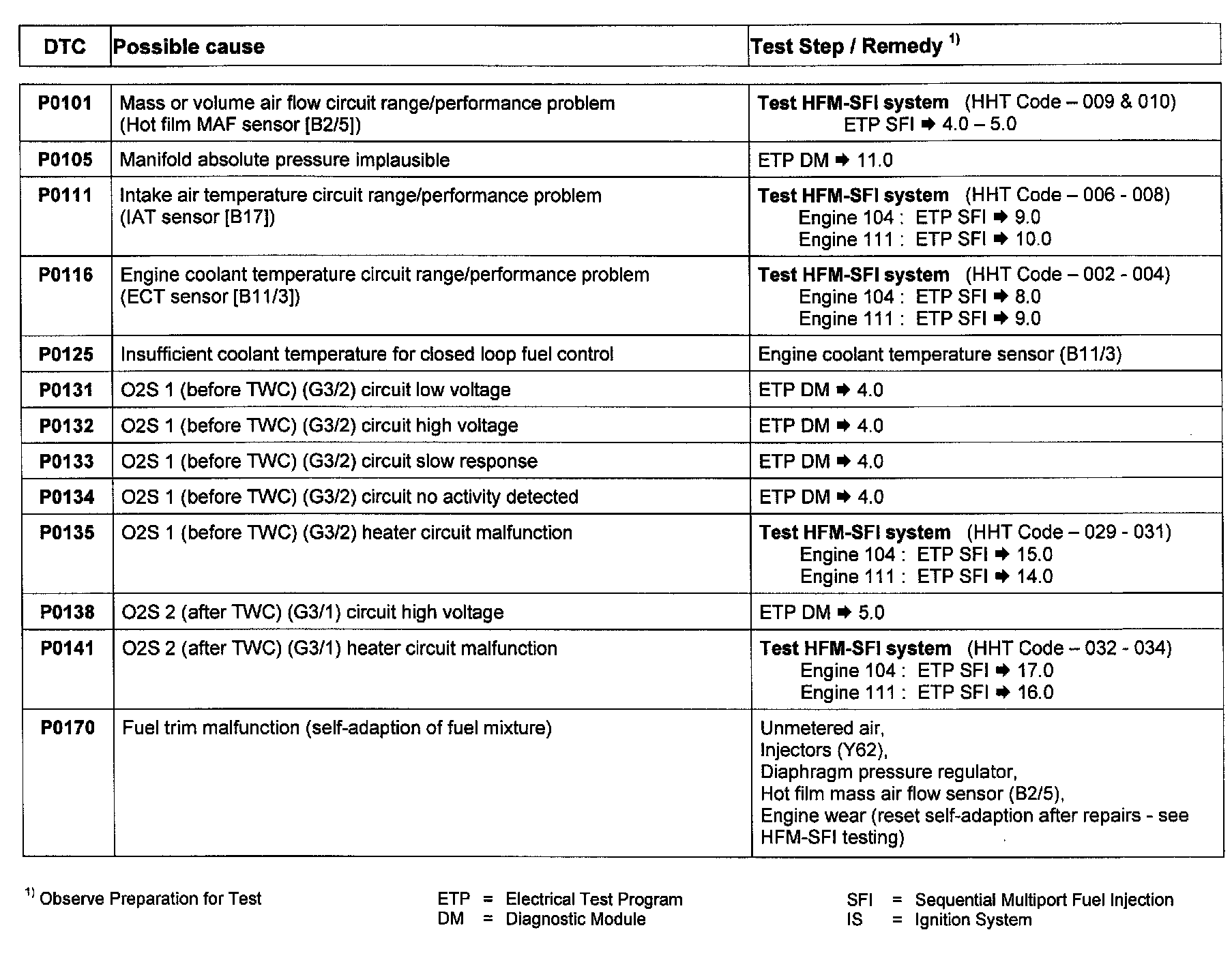 When the following charts refer to testing of another system, Mercedes Benz recommends testing the complete system (ie, Test HFM-SFI System). For your benefit, we have included links to the appropriate section of the system test programs. (ie, ETP SFI -> x.x) This in no way ensures complete correction of all faults of those systems, as not all faults can be read through the Diagnostic Module.