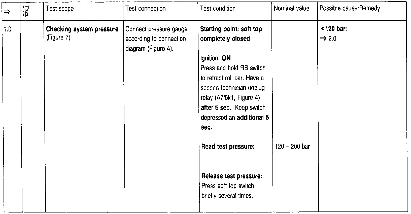 Activate power soft top switch (toward lower if the soft top is down, toward raise if the soft top is up) for 5 seconds. Have a second technician disconnect relay (A7/5k1, Figure 4). Hold power soft top switch for 5 additional seconds. Read and record test pressure.