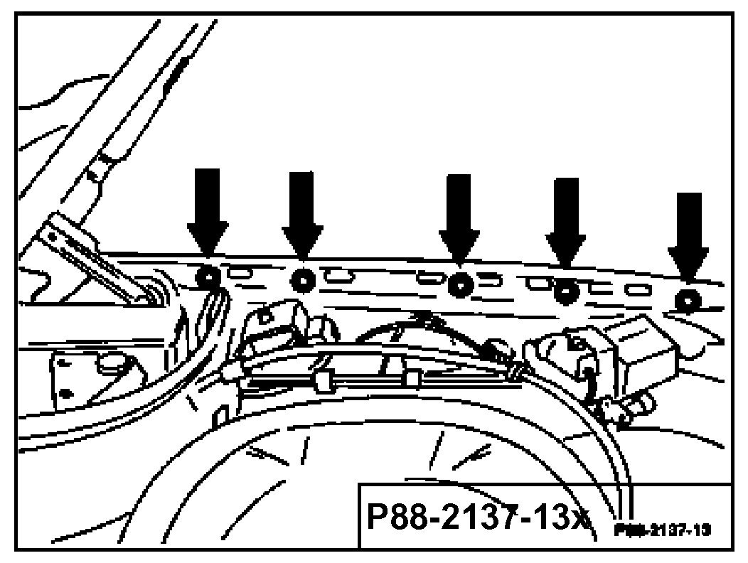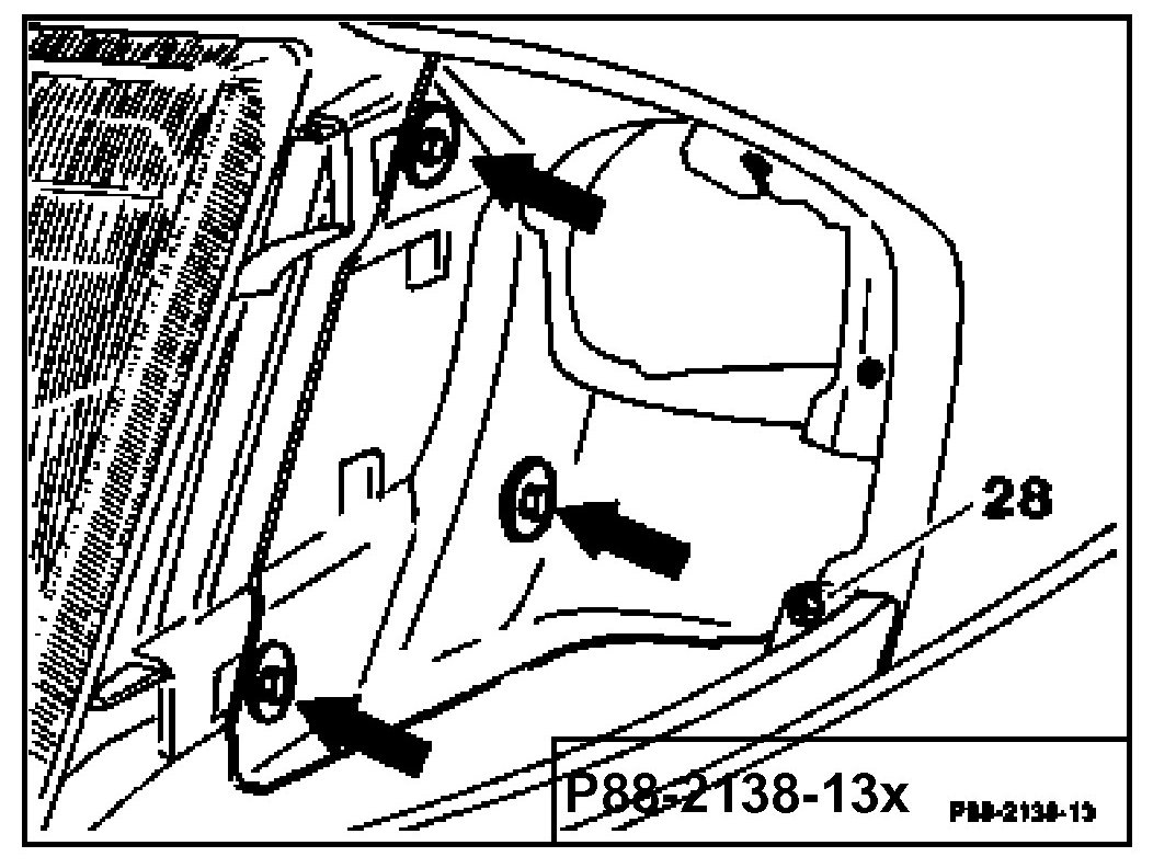 5 Screw out screws (arrows), and screw (28) for headlight molding on turn signal light cutout.