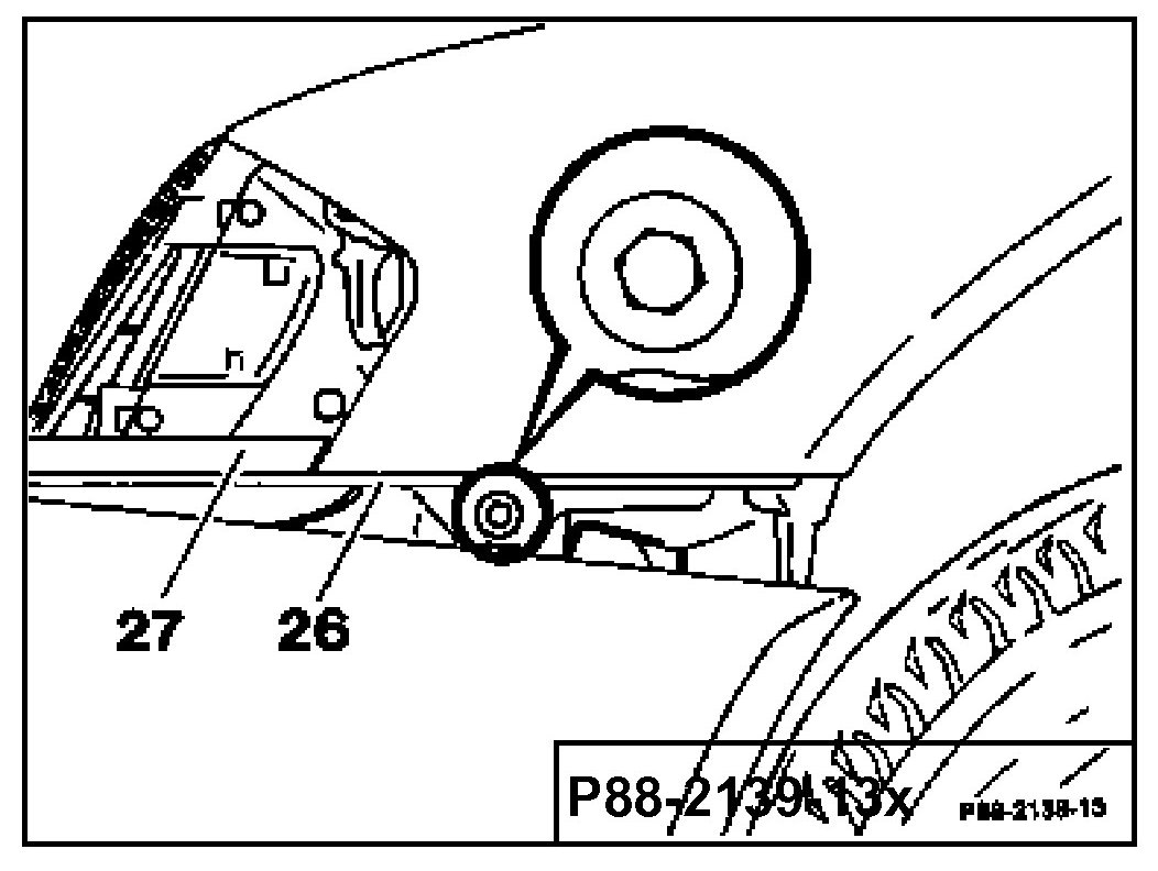 6 Pull bumper down and screw out screws. Remove rubber seal (26) from front fender.