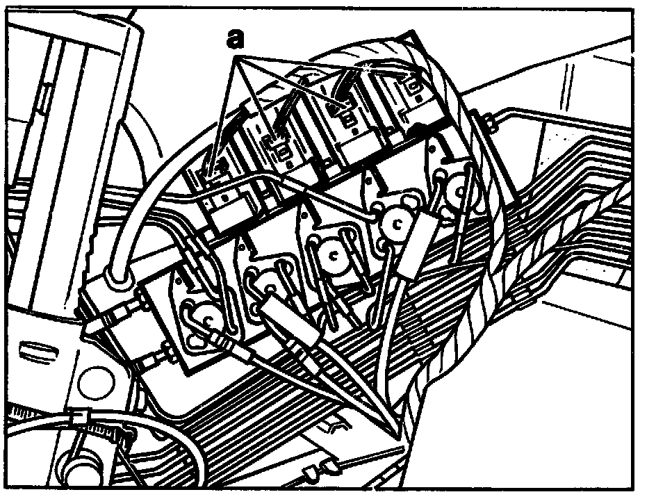 NOTE: Hydraulic line no. 101 (d) is under pressure. When the hydraulic line is disconnected cover connection with rag. Screw plugs onto hydraulic lines and into connections on valve block immediately.