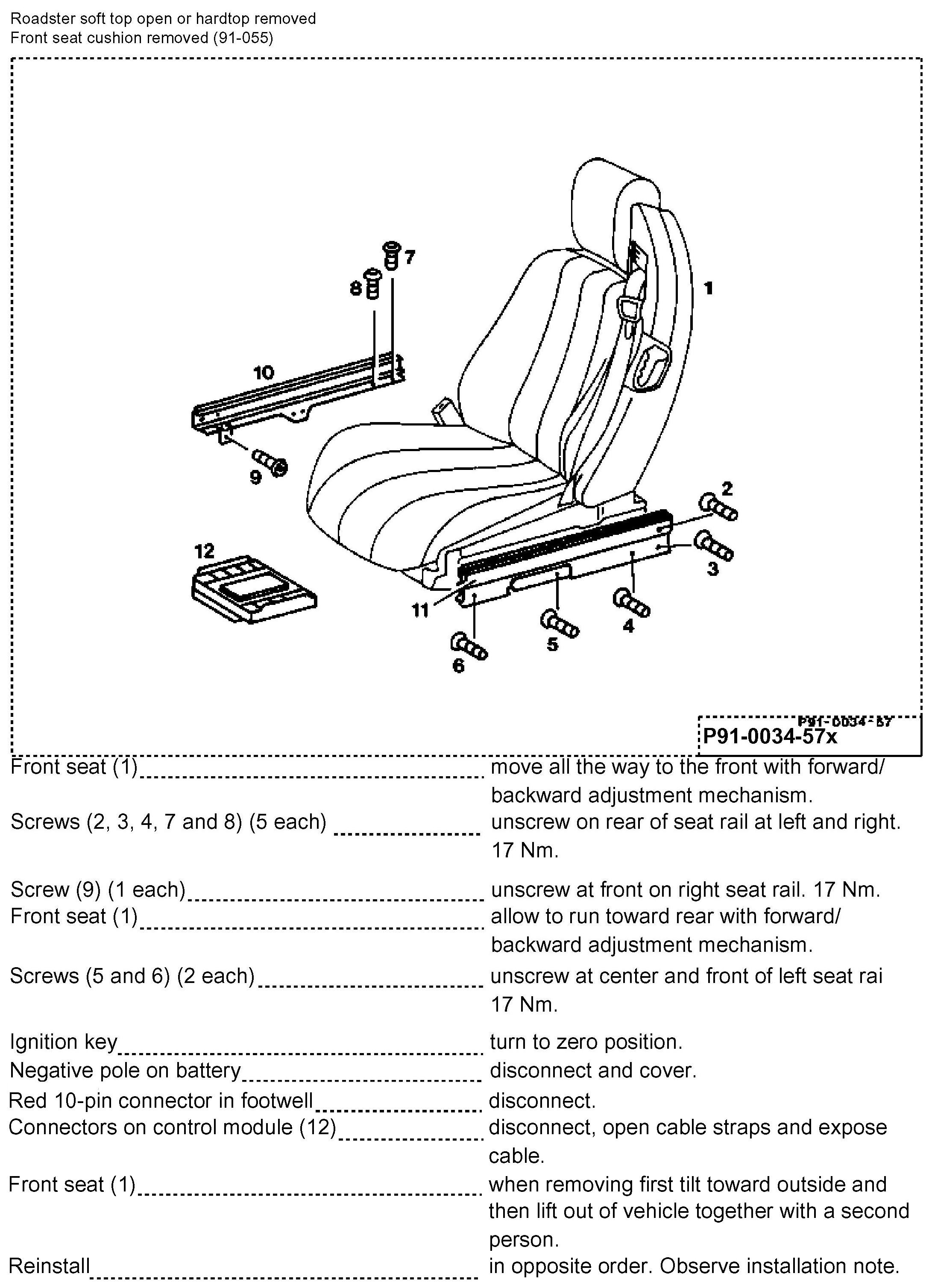 This is stored as a malfunction in the control module for the airbag and emergency tensioning retractors. The memory must be erased after reinstalling the seats (Diagnosis Manual, Body, Volume 1, Index no. 11 Airbag).