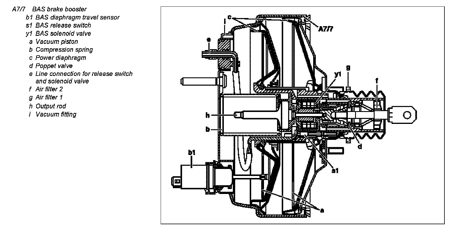 An emergency stop is detected by the BAS control unit via the BAS diaphragm travel sensor (b1) In the case of a BAS brake application, the BAS solenoid valve (y1) opens valve (d), which admits atmospheric pressure from inside the vehicle via the air filters (g and 0 to the rear of the power diaphragms (c).