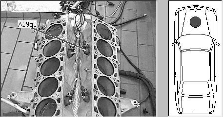 Top of engine, in valley (engine viewed from front, out of vehicle)
