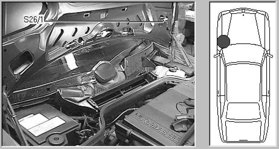 Left rear underside of engine hood