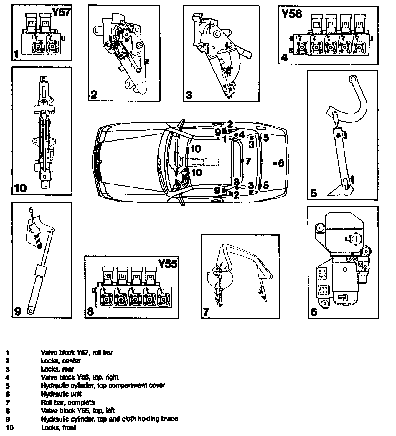 A 12 V hydraulic pump is used to supply pressure to the entire system. The system pressure is limited to max. 180 + 10 bars by a pressure limitation valve (DBV). The hydraulic unit has 4 connections (No. 10 roll bar drive, No. 11 test connection, No. 12 top drive, No. 13 return). The hydraulic unit is located in the spare tire recess.