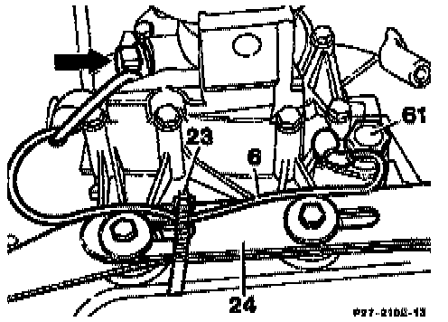 28b. If automatic transmission: Loosen cable strap (23) and unscrew cable (6) at the kickdown solenoid valve (61) or pull off. Unscrew fastening bolt for the pulse generator (arrow) and pull out the pulse generator.