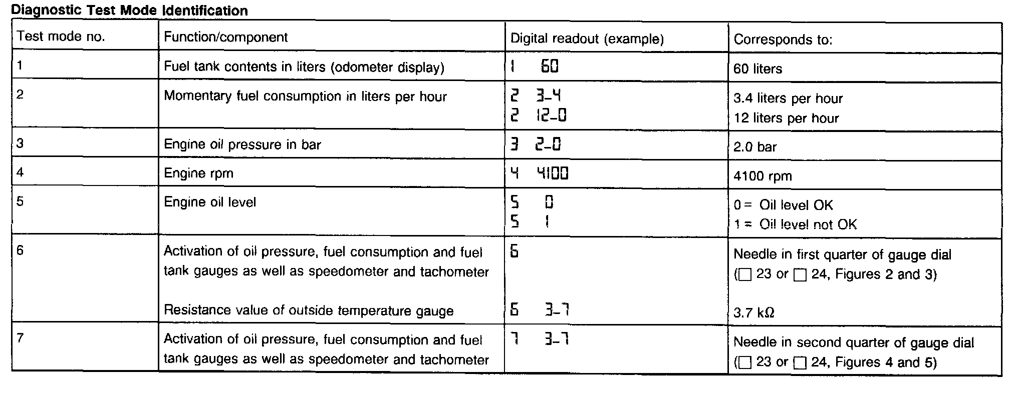 - During test mode 2 "Momentary fuel consumption in liters per hour", the consumption values are indicated by a three or four digit display:
