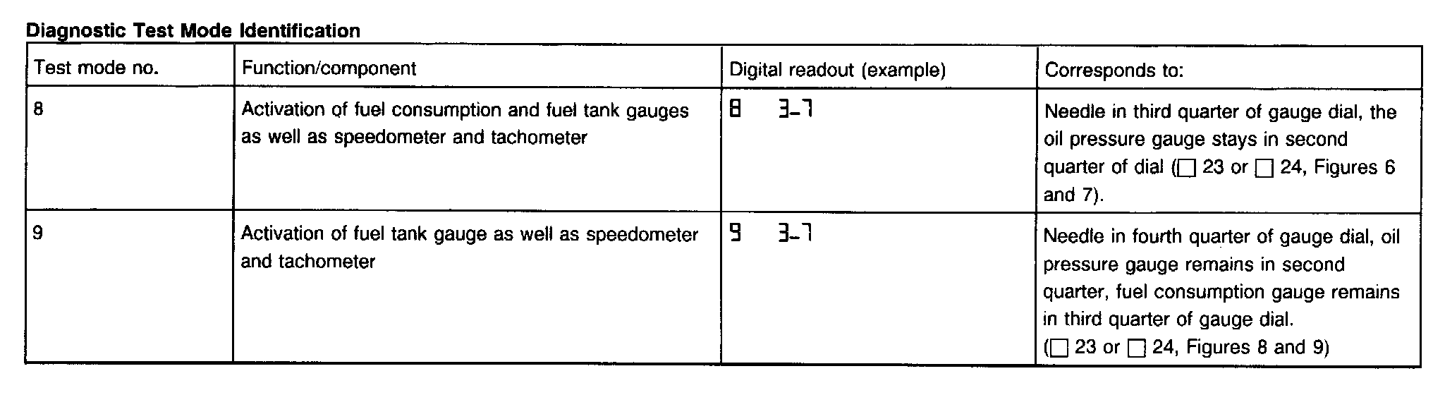 - There are 9 test modes available which are indicated via the odometer display. The test mode number is indicated by the left digit in the display and the test values are the digits on the right. A comma is indicated by a low dash.