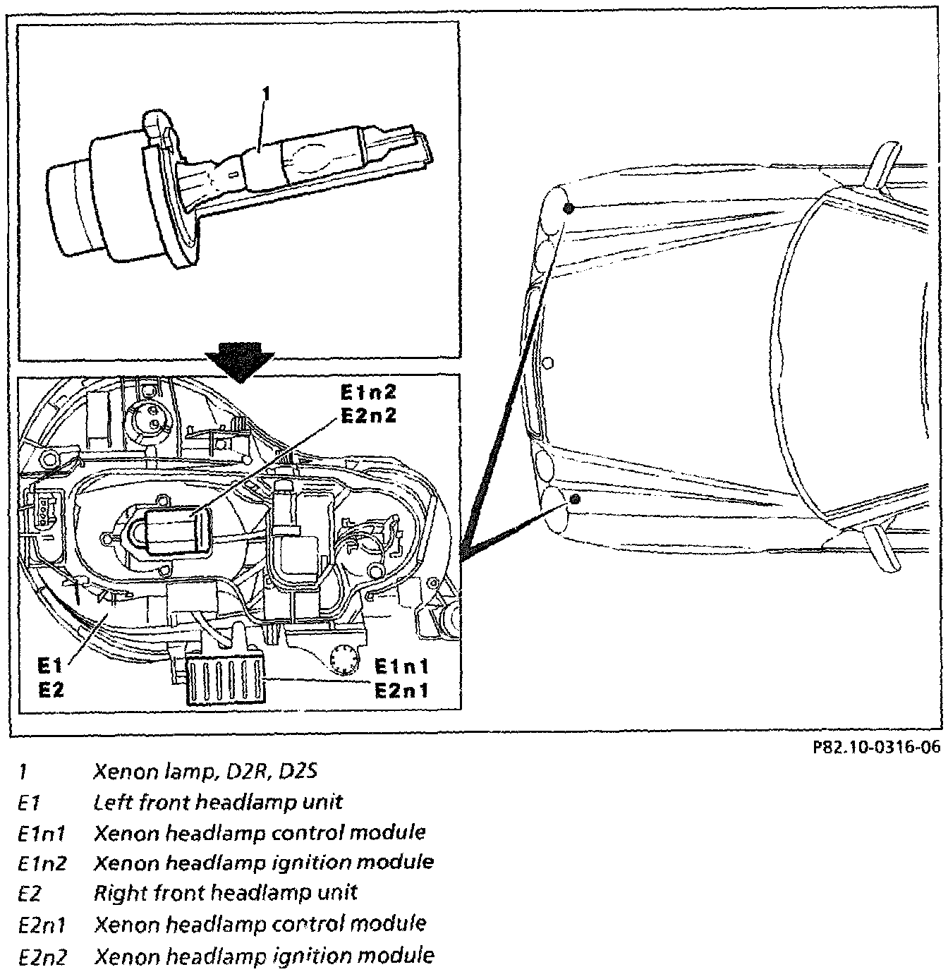 The xenon lamp ignites due to a high voltage surge (approx. 20 kV) from the ignition module striking an electric arc between the electrodes. When an arc of sufficient stability is recognized the electronic circuitry in the control modules (E1n2, E2n2) switches over to operation with limited power.