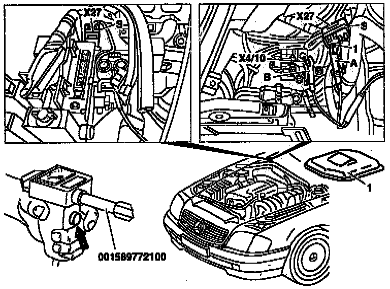 4. Connect clamp (A) of compression pressure recorder 001 589 77 21 00 at pin 1 of connector (S).
