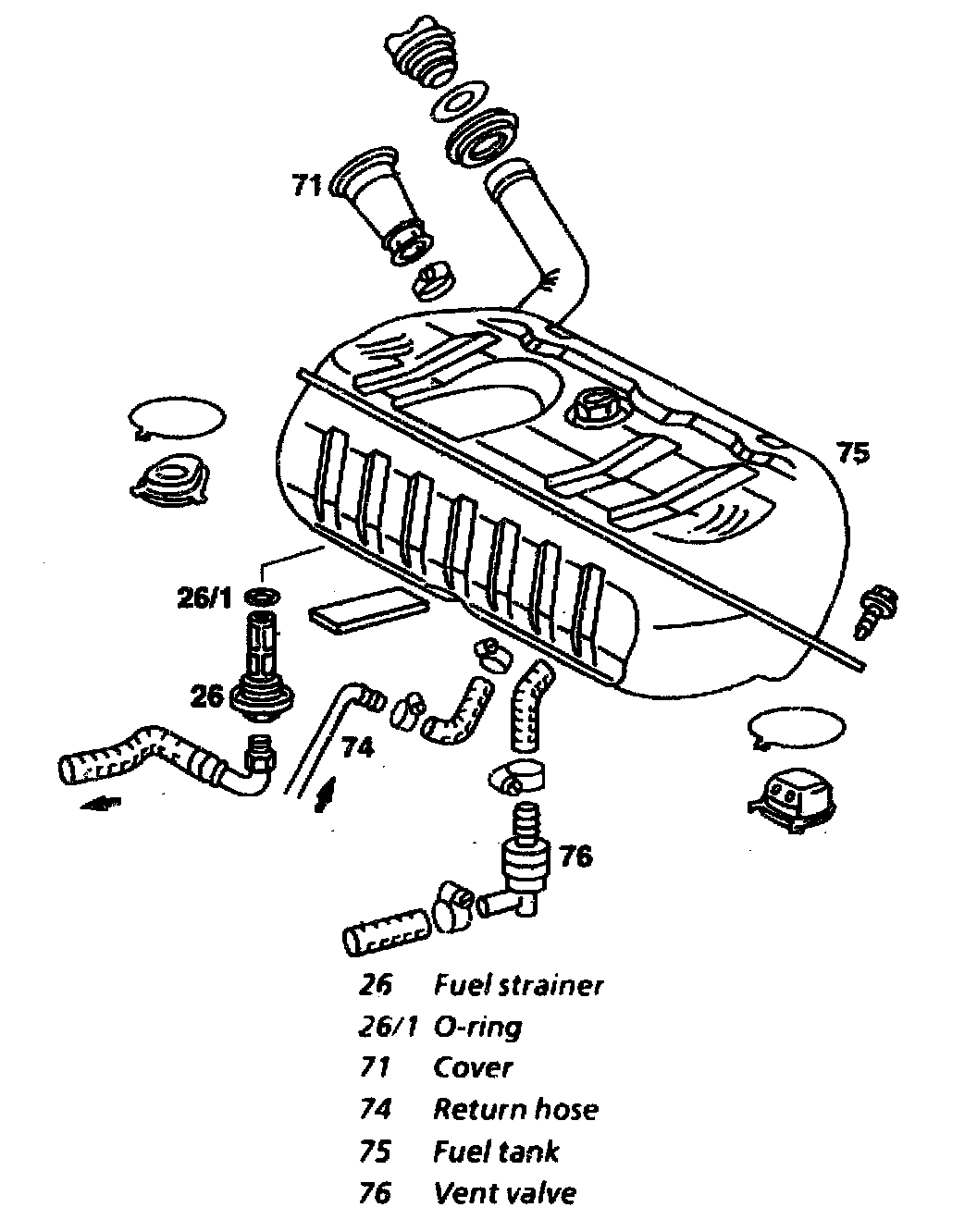 5 Remove vent valve (76) and fuel return hose (74). To do this, detach and hang exhaust system from the rubber rings. Remove left drive shaft at inner coupling flange.